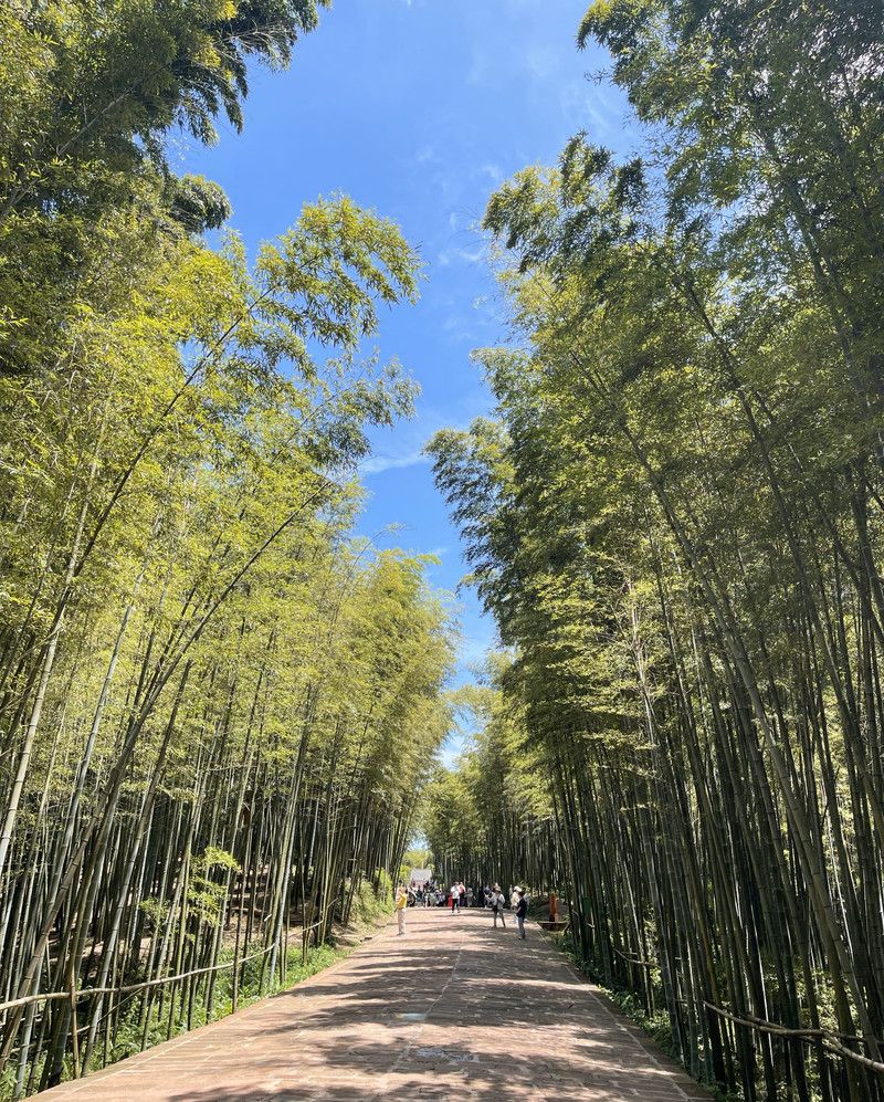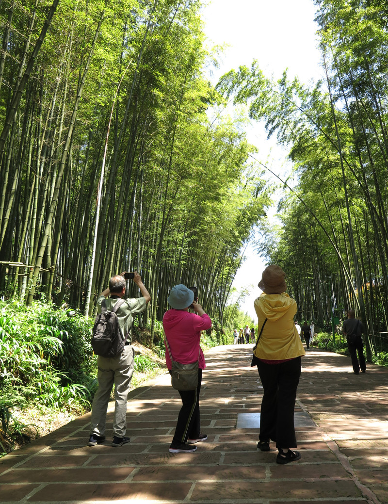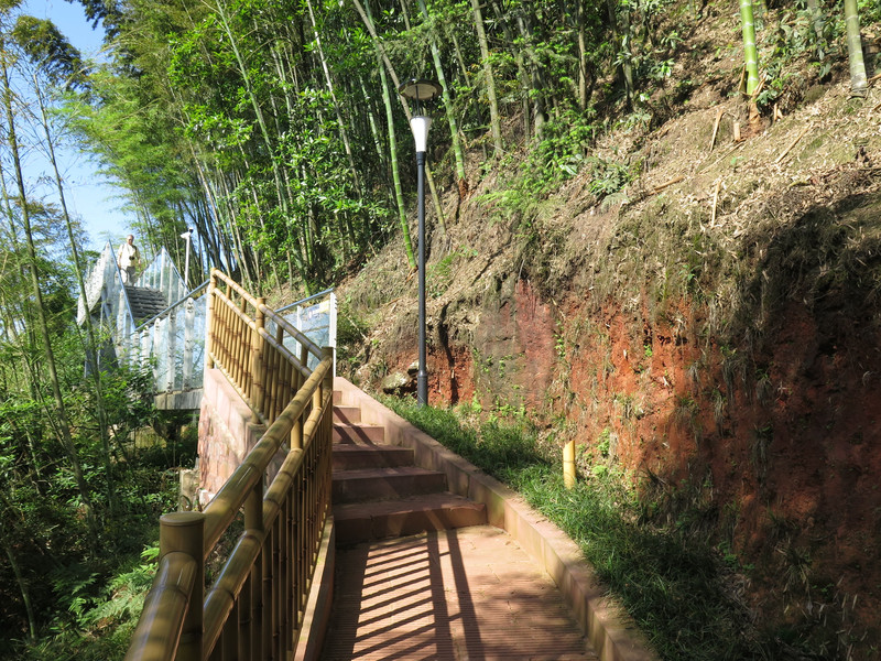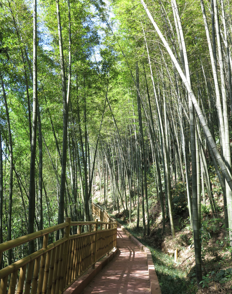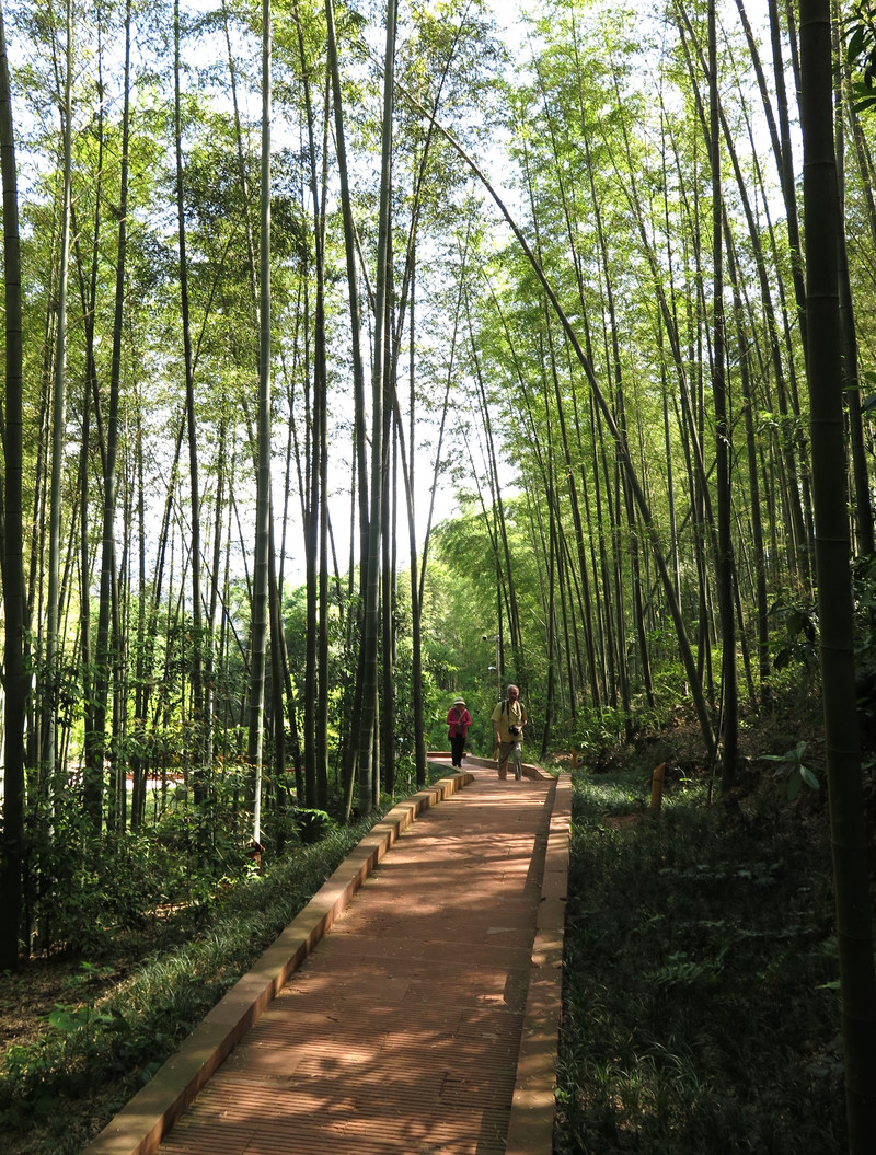 翡翠长廊,路面是色如渥丹的天然红砂石铺成,两旁高大、密集的翠竹微向内顷,形成蔽日遮天的拱廊,俨然一条迎宾大道。天气好的时候,阳光透过竹林洒在道路上,美不胜收。