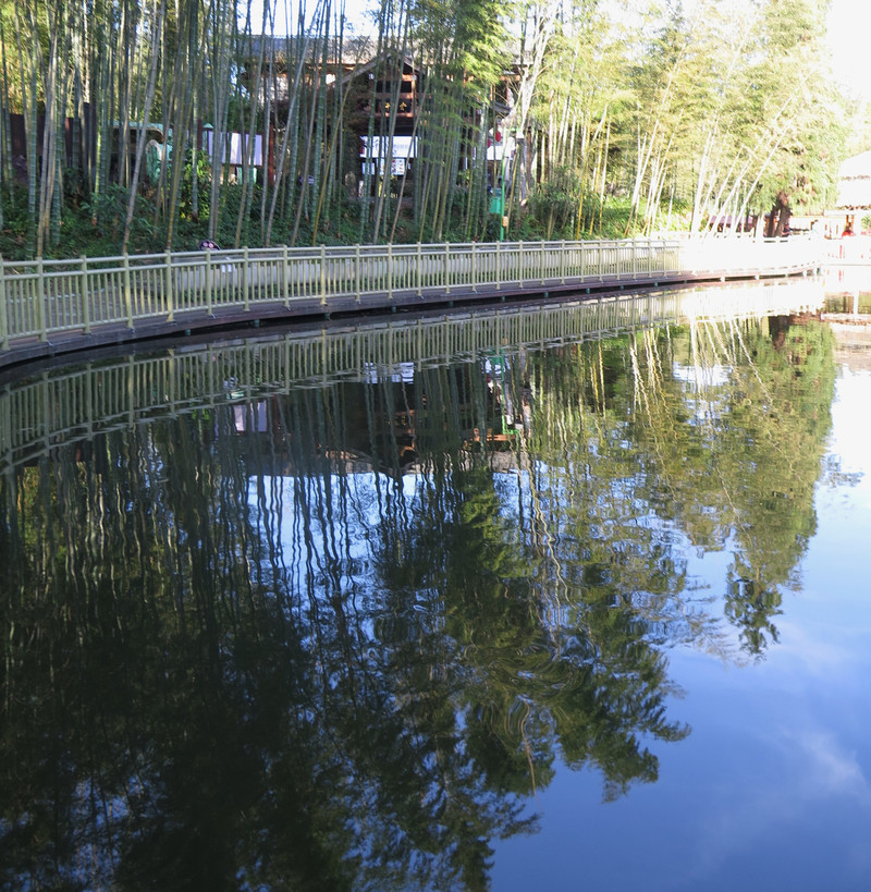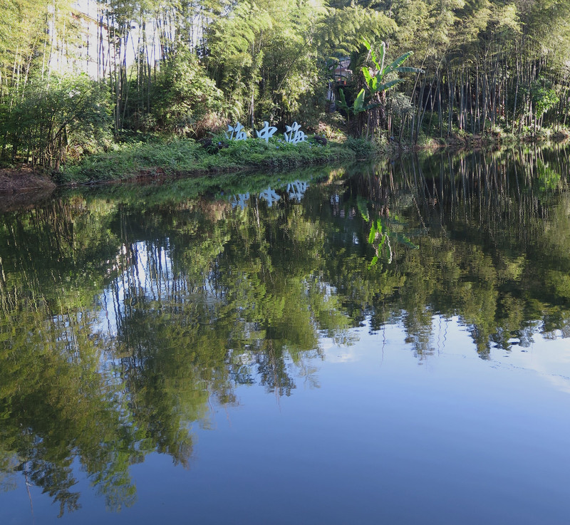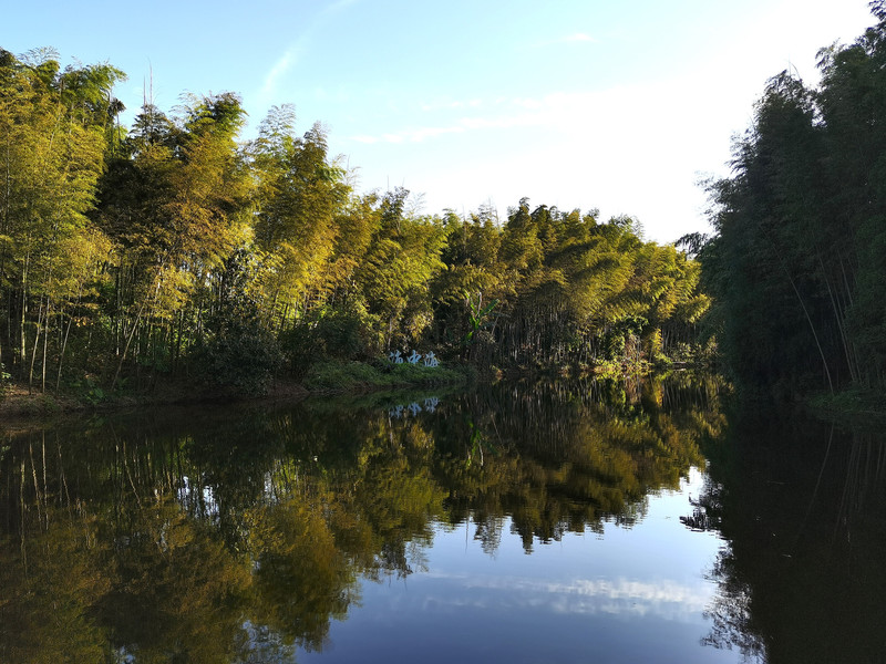湖面上倒映着竹林婆娑的身影,还有蓝天、白云,赏心悦目的画面。