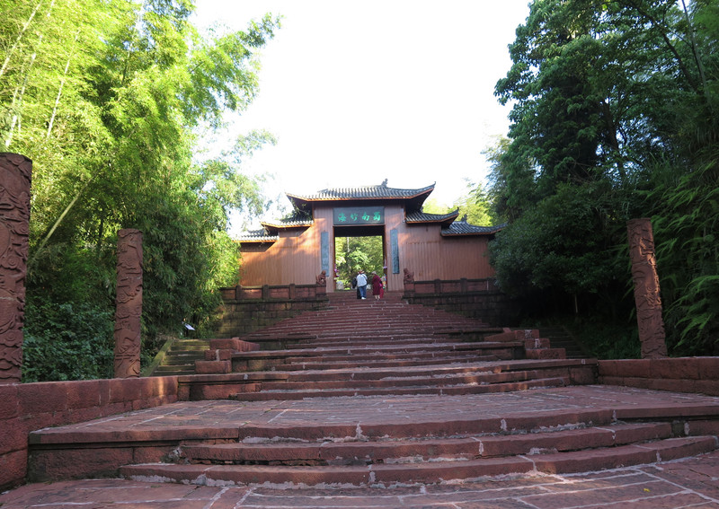 大门前的台阶路及石柱呈棕红色,该是就地取材。