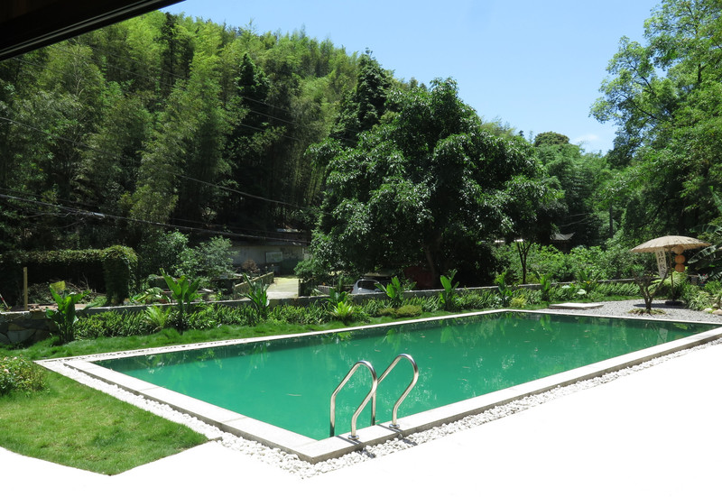 实地观之,可谓超预期地满意,洋气的三层小楼,落地大玻璃窗,竹林、溪流景观,自带花园、泳池,有停车场。老板十分热情,还提供了景区游览建议。