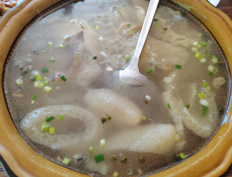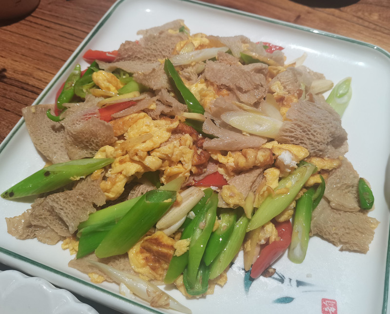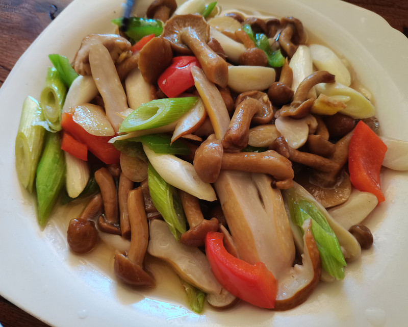 因为提前打了招呼,菜很快上桌:三鲜竹荪汤,土鸡蛋炒竹燕窝、笋子回锅肉、清炒杂菌,都是竹字打头,竹海出产之物。厨师手艺也不错,色香味俱佳,少油、少盐,适合我们口味。