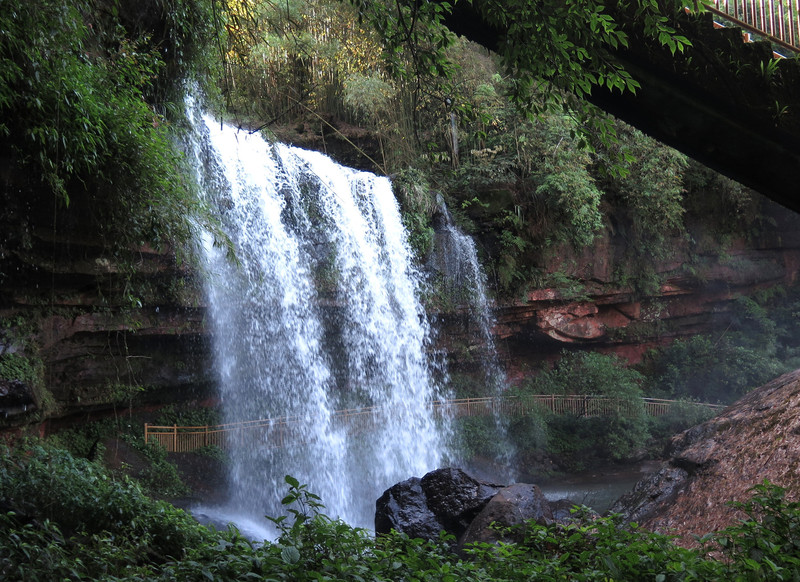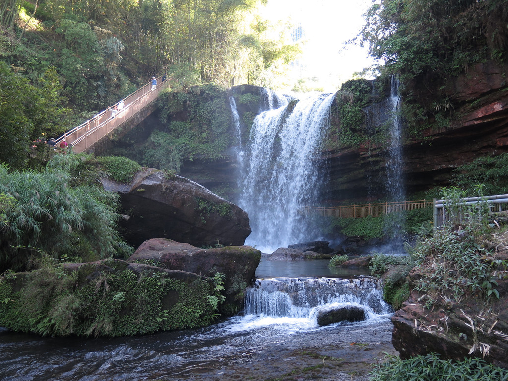 七彩飞瀑处在两山之间的葫芦谷中,从森林里流出的水潦河,在回龙桥下分为四级泻下悬崖,整个瀑布群落差达200米,水量充沛,气势壮观。不同角度可以看到美丽的彩虹,尤其是阳光充足的时候,美到极致。