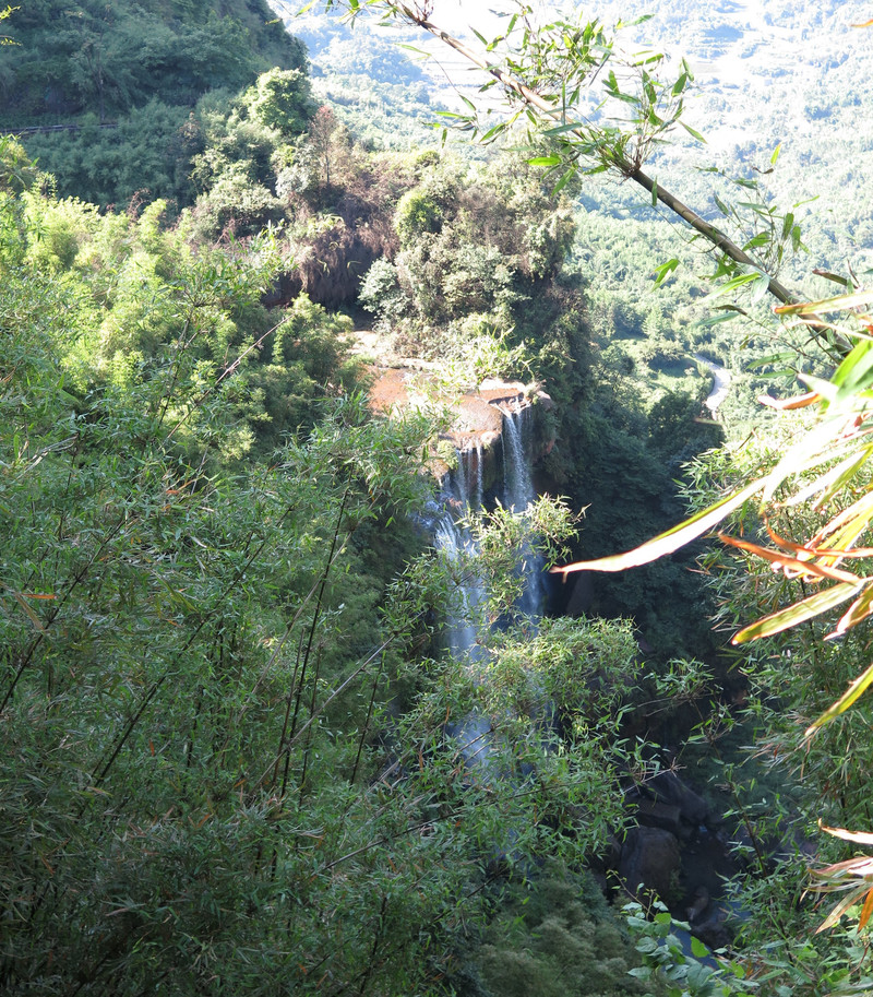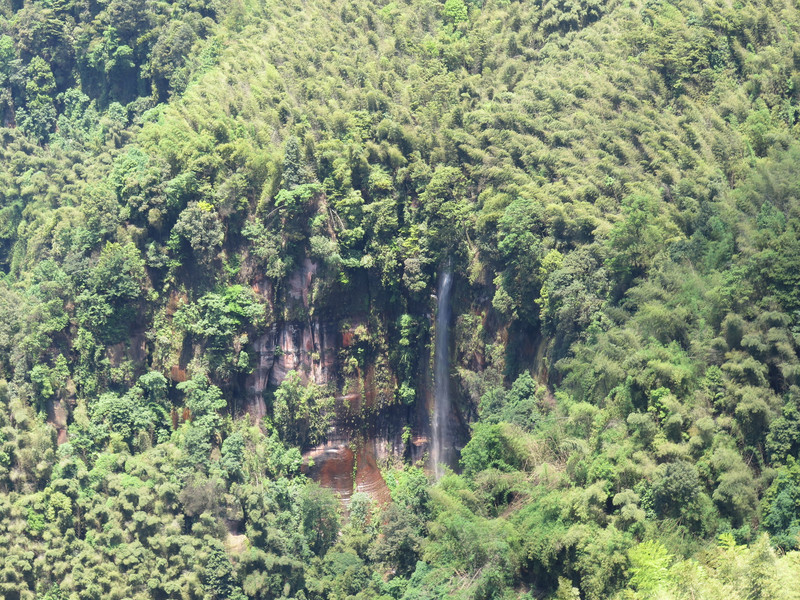 拉近镜头,半山崖壁的竹林簇拥中一道瀑布飞泻而下。