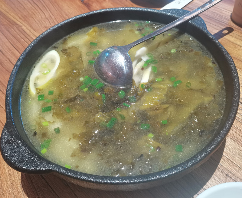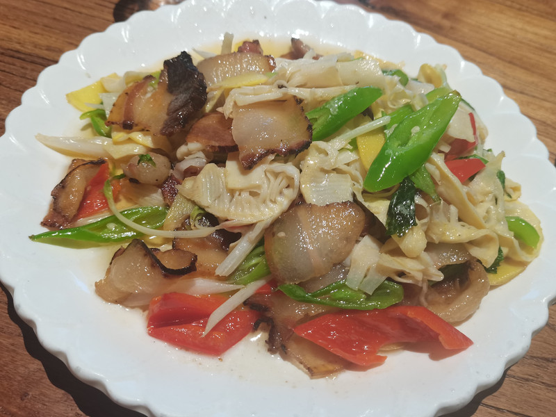 晚餐依然在观山语民宿,厨师是老板娘的父亲,大约五十出头,精干利落,厨艺堪赞。菜品依然都是竹海出产的食材:酸菜苦笋汤、清炒竹灵芝、冬笋炒腊肉、五彩竹毛肚。